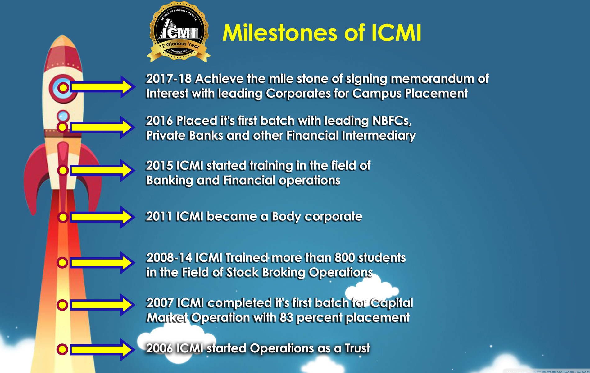 ( आई सी एम आई लर्निंग प्राइवेट लिमिटेड की एक यूनिट, और आई सी एम आई एजुकेशन प्राइवेट लिमिटेड ग्रुप कंपनी, ) ने देश में फाइनेन्स, बैंकिंग एवं शोध को बढ़ावा देने के साथ साथ ,जॉब ओरियेन्टेड तथा कौशल पर आधारित ट्रेनिंग देने में अग्रणी संस्थान के रूप में उभरने के लिए आरम्भ से ही अत्यधिक निपुण फैकल्टी, अत्याधुनिक इन्फ्रास्ट्रक्चर और प्रेरणादायी छात्रों के साथ कार्य किया है।