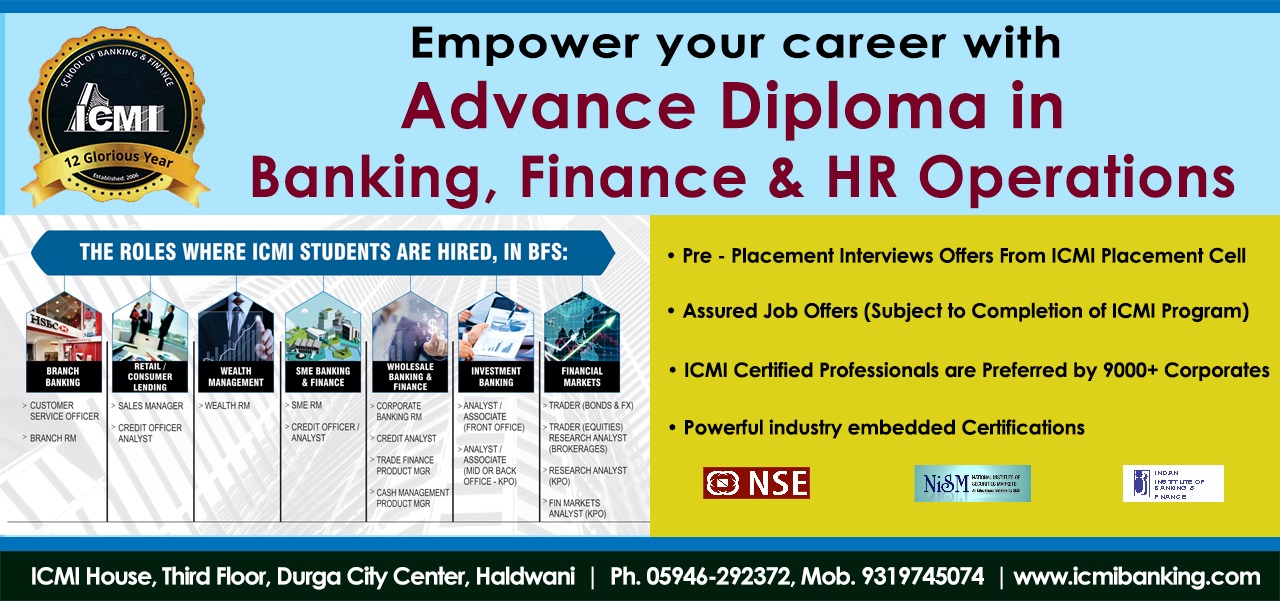 ICMI School of Banking & Financial offers Advance Diploma in Banking & Financial Operations. The objective of this diploma program is to groom candidates for core Banking & Financial operation jobs.